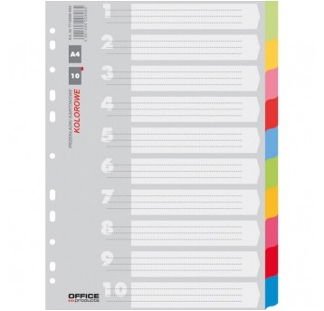 Kolorowe przekładki Office Products A4 10+1 wykonane z kartonu 170 gsm z recyklingu ułatwiają segregowanie dokumentów w biurze i szkole. Karta opisowa i mix kolorów zapewniają czytelny podział treści.