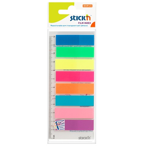 Klasyczne zakładki indeksujące w 8 kolorach neonowych: niebieskim, zielonym, żółtym, różowym, pomarańczowym, jasnoniebieskim, jasnoróżowym i filoletowym - 8 bloczków po 25 zakładek o wymiarach 45 x 12 mm