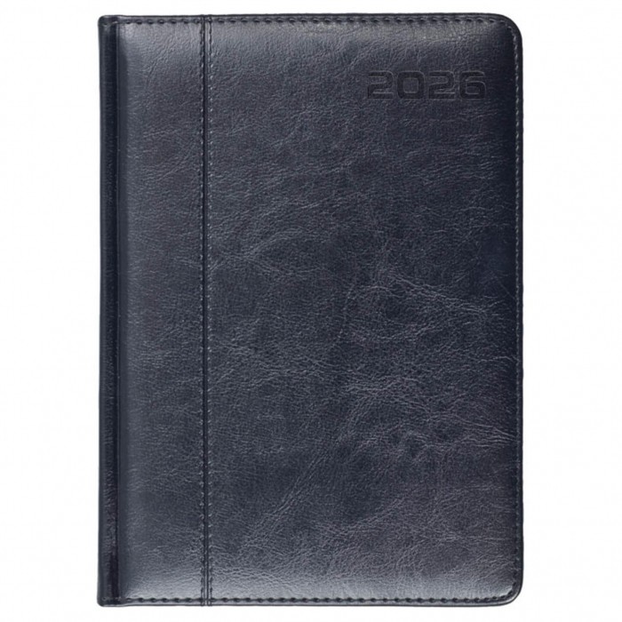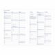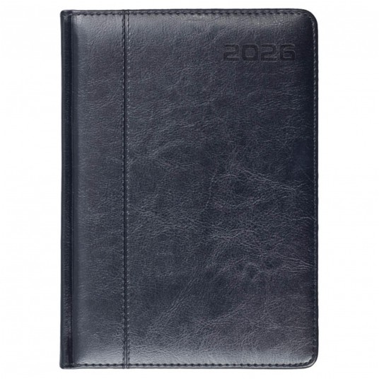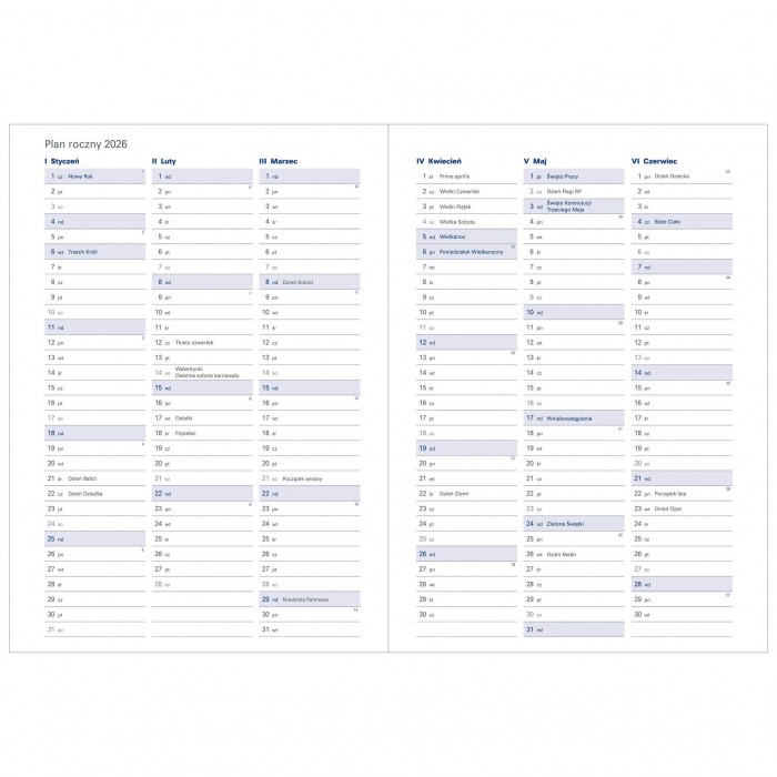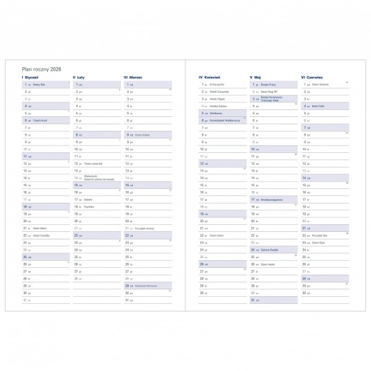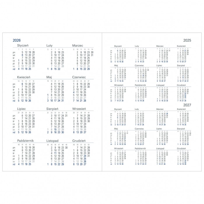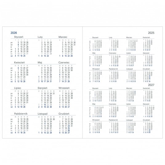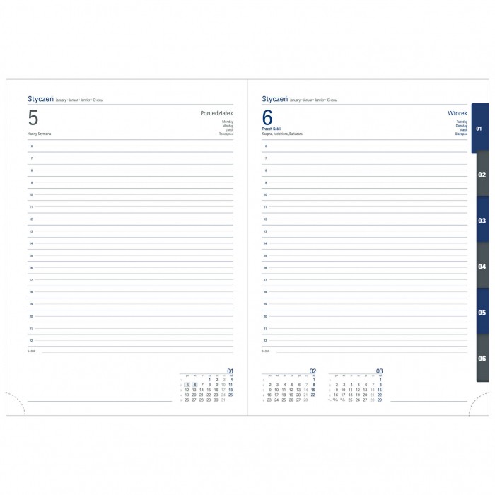 Terminarz w układzie dziennym, drukowany na papierze białym. SOBOTA i NIEDZIELA na osobnych stronach. Kolor druku szary i granatowy. Język: PL/EN/DE/FR/UK.