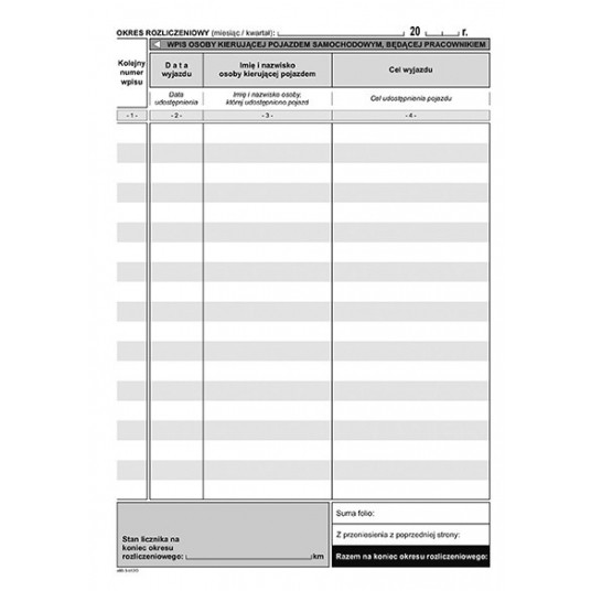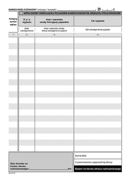Druk przeznaczony jest dla przedsiębiorców, firm transportowych, jednoosobowych działalności gospodarczych, biur rachunkowych oraz wszystkich podatników objętych podatkiem VAT, którzy zobowiązani są do prowadzenia ewidencji przebiegu pojazdu. Sprawdzi się również w instytucjach i organizacjach wykorzystujących pojazdy służbowe w codziennej działalności.☝️